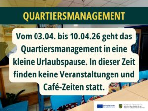 - Przerwa urlopowa w zarządzaniu dzielnicą (Quartiersmanagement)Od 03.04. do 10.04.2026 zarządzanie dzielnicą (Quartiersmanagement) ma krótką przerwę urlopową. W tym czasie nie odbywają się żadne wydarzenia ani dyżury kawiarenki. Życzymy wszystkim wesołych Świąt Wielkanocnych!